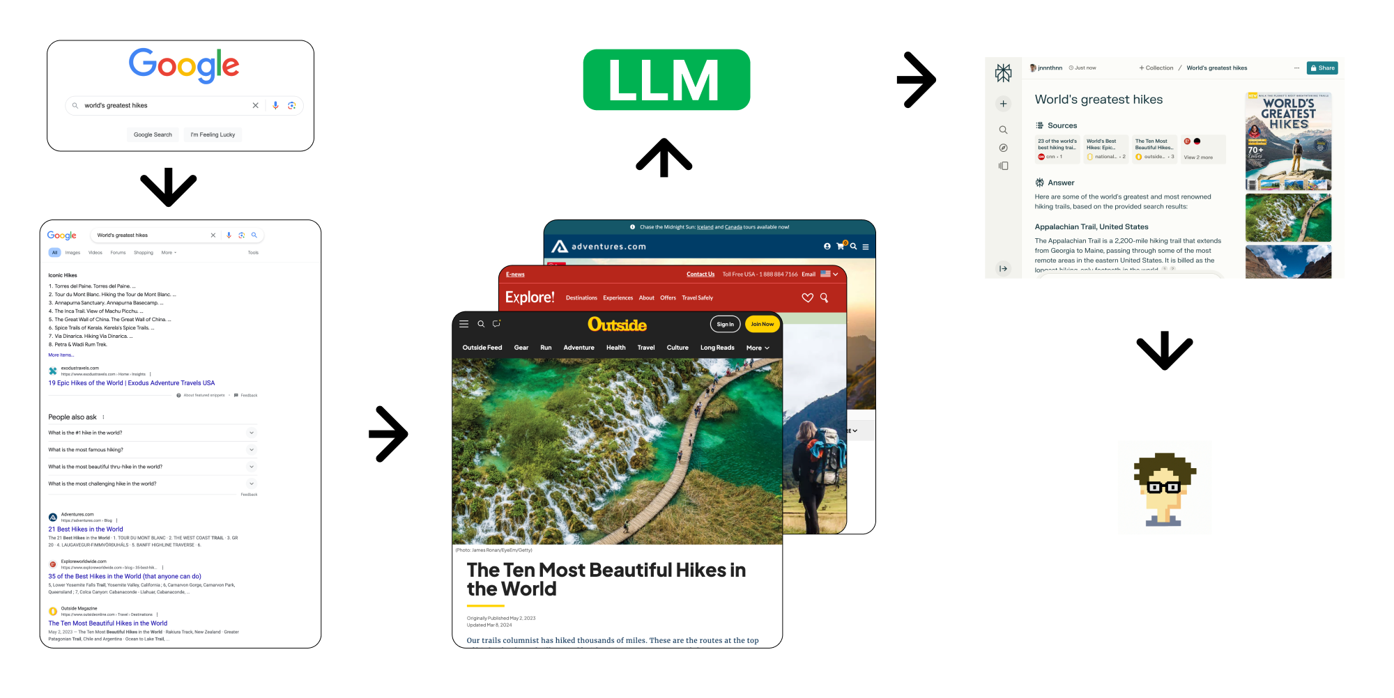 The links that feed into the generated summary are what allows the LLM to leverage data it might not have seen or retained from training, and helps avoid hallucinations. This makes for a really great user experience! If I have a factual question that Google doesn't immediately surface in a card, I might need to go to multiple pages, sometimes full of ads, each with distinct layouts, just to piece together the various components of available information. Through Perplexity, that work is done for me almost instantly by an LLM. Magic!